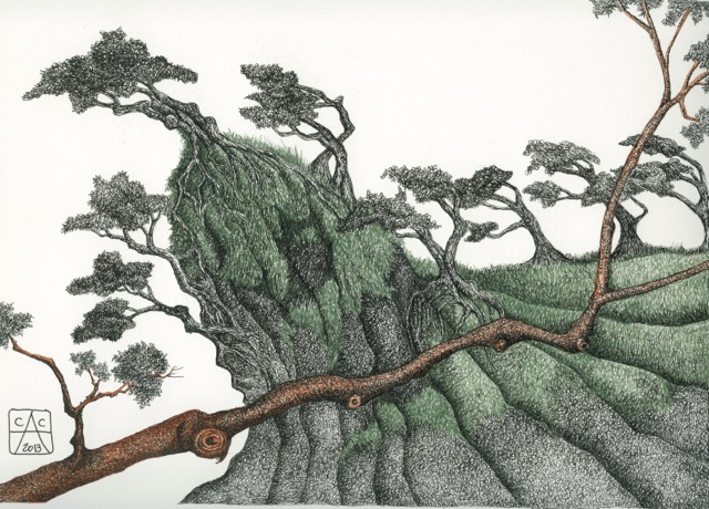 Gorgeous drawings, especially those trees that make the best of difficult surroundings, clinging to their scant support however they can & reaching for the sun, though buffeted by harsh winds. To me they are even more beautiful than the lush, pampered specimens. And so it is with people.